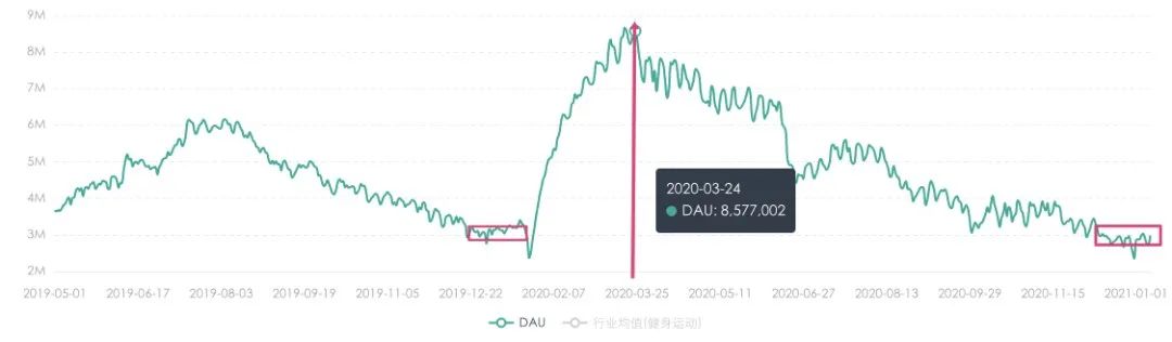 另一边,Keep自己的数据也表明,平台粘住用户的能力还有所欠缺。2020年3月,也是疫情比较严峻的时候,Keep曾有高达850万的活跃用户。时隔数月后发现,暴涨的那群人并没有很好的被留存住。秋冬之后,Keep的DAU(日活跃用户)又跌回了前一年同期(2019年底-2020年初)300万左右DAU的水平。