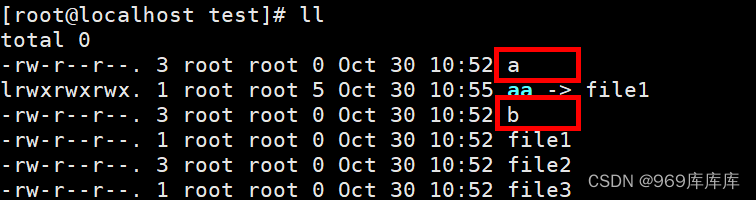 [root@localhost test]# ln file2 a //创建硬链接a