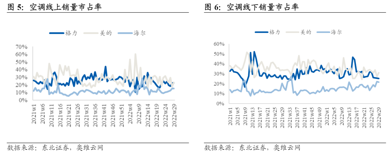 奥维云网统计的数据显示,今年上半年美的空调线上市场占有率为30.47%,力压格力的29.78%位居榜首,海尔则称雄冰箱和洗衣机市场。赛迪研究院的报告则指出,2021年格力线上渠道收入占比仅在13%-14%左右,远低于行业平均的52.9%。从占有率来看,和2020年相比格力空调业务线上销售占比仅上升不到3%。