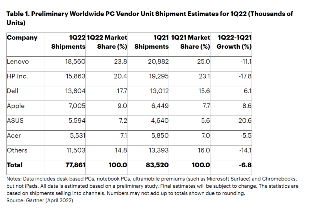 并且,根据Gartner最新的统计结果显示,全球个人电脑(PC)在2022年第一季度的出货量总计7790万台,同比下降6.8%。一季度,联想以23.8%的市场份额排在首位,但出货量同比减少11.1%。