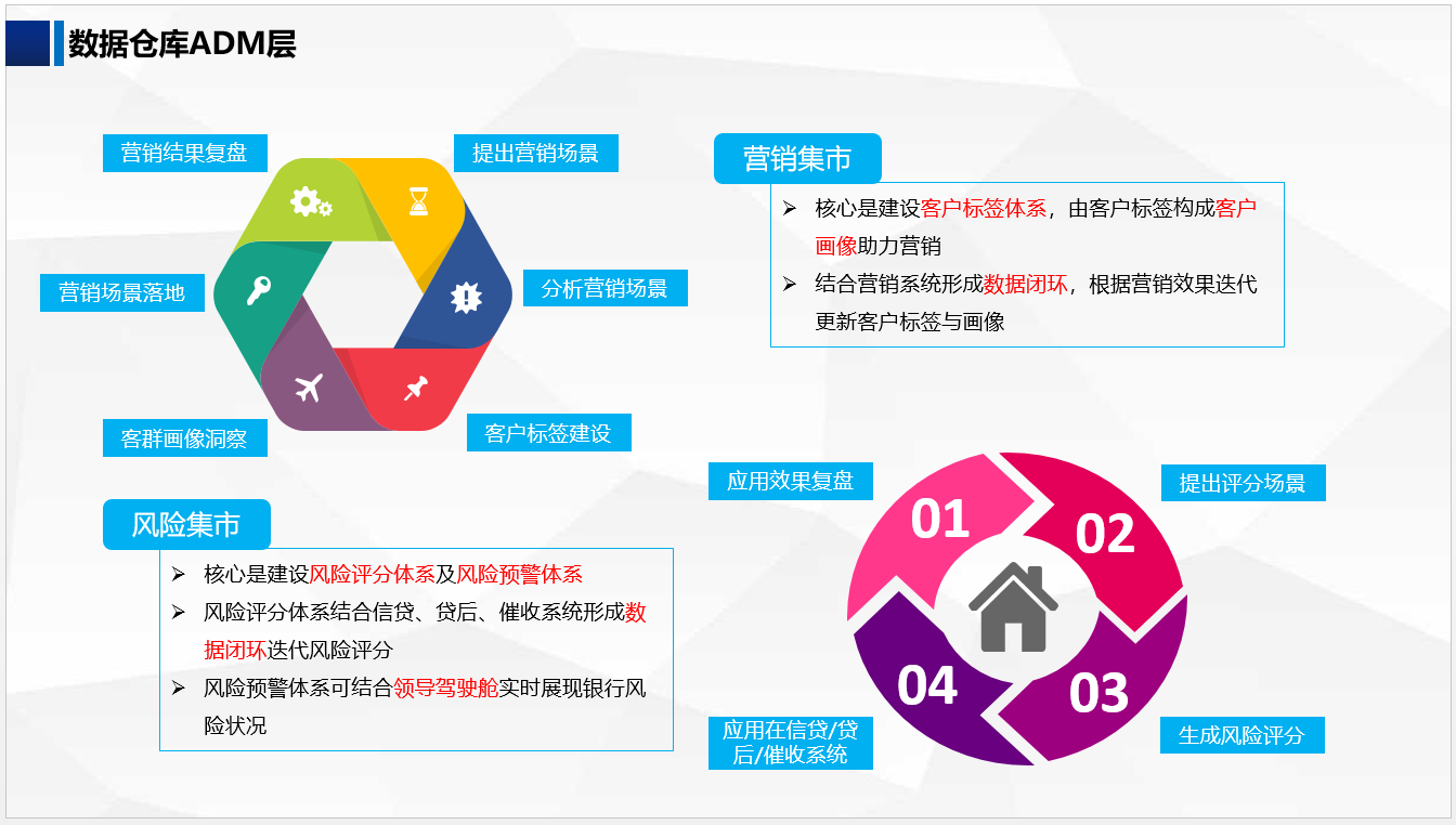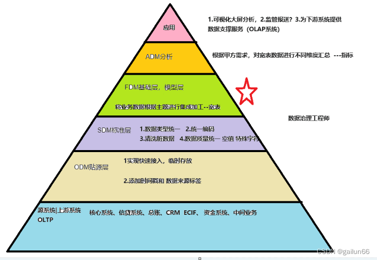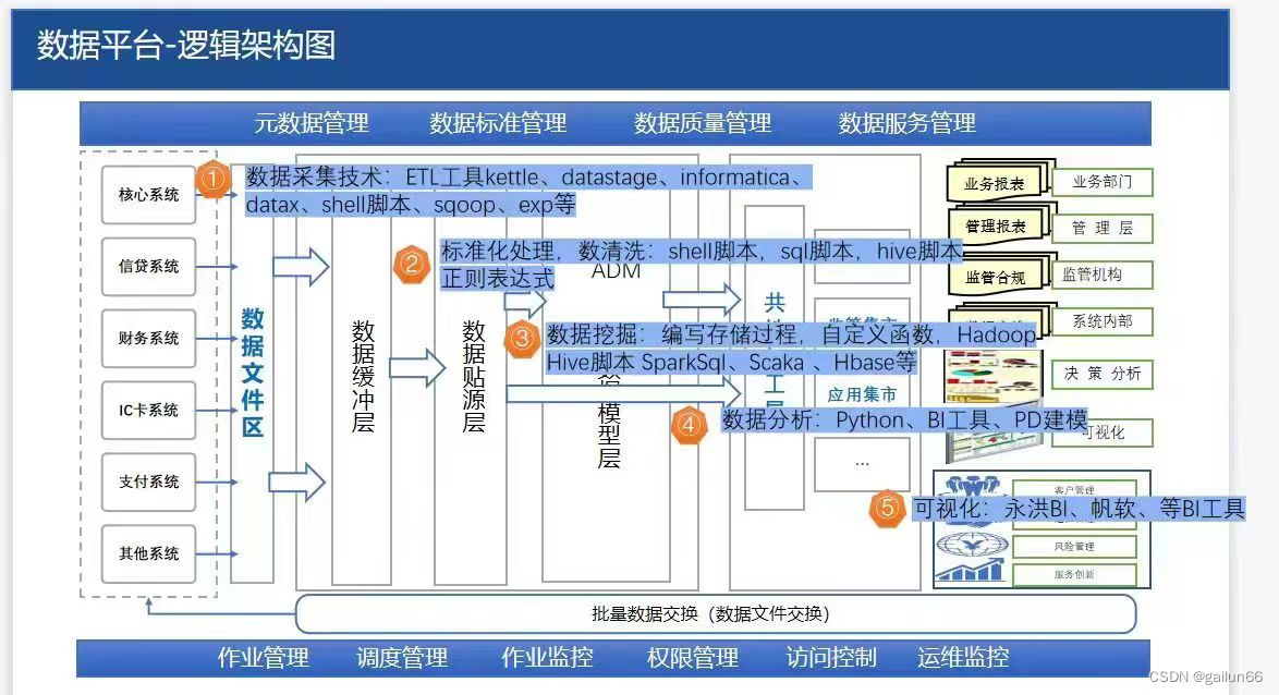 在建设一个银行数据仓库项目时,数据流向是将源系统(OLTP)中的数据通过elt工具(如kettle)传输到ODM贴源层和SDM标准层,实现快速接入和临时存放,并添加了时间戳和标签,然后再通过etl工具中的各类组件实现数据类型的统一、编码的统一、数据质量的统一(去除空值和特殊符号)并清洗脏数据(与字段不相符的数据);然后通过数据挖掘技术(FDM层)(如编写存储过程、使用hive脚本、使用odpsSQL语句处理大数据),根据数据字典将业务数据根据主题集成加工成业务宽表(映射关系);随后传入到ADM应用层,应用层是用于提供分析性的数据,支持各种可视化大屏分析、报表、监管报送、为下游系统提供数据支撑服务(OLAP系统),ADM层常用的工具包括数据可视化工具(如可视化技术、FineReport、FineBI、永洪、MSTR、HTML5 CSS JS VUE PHP)
