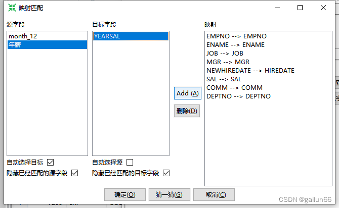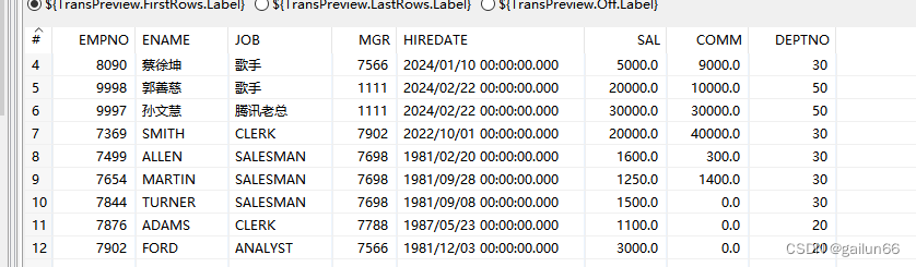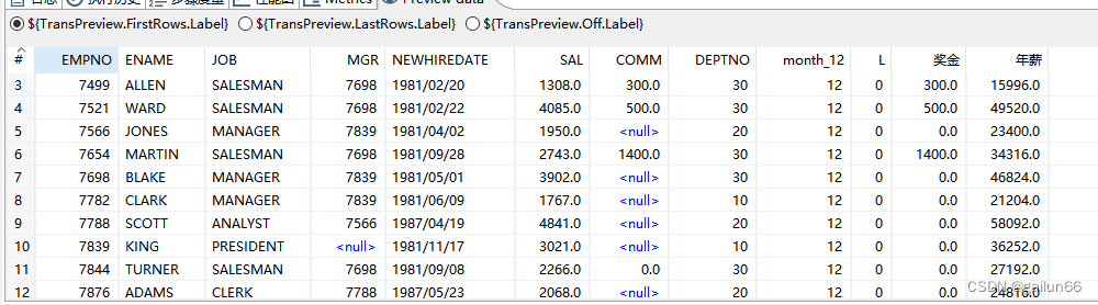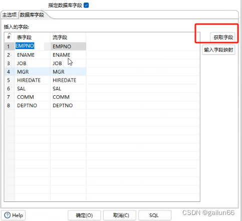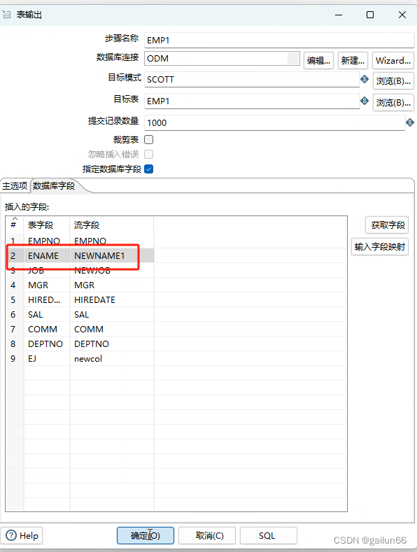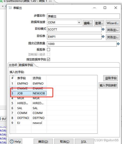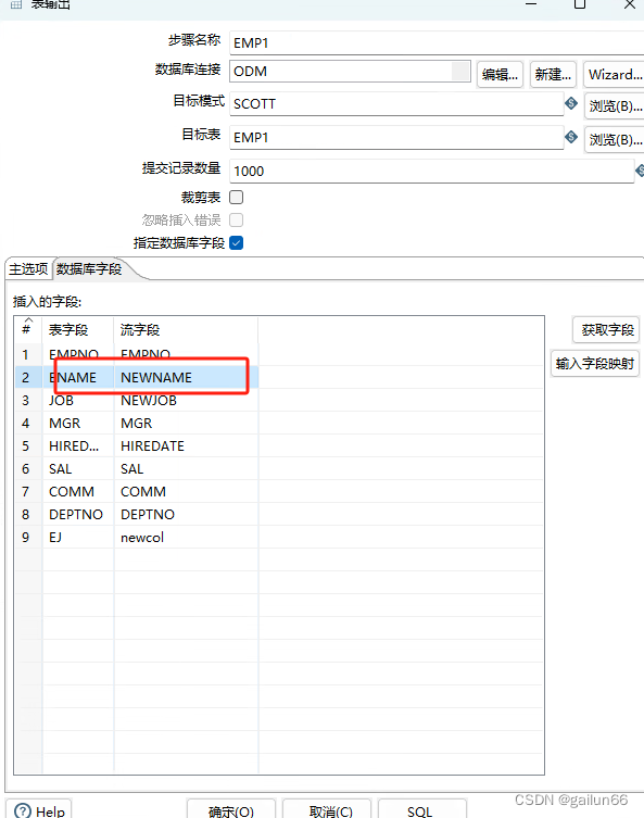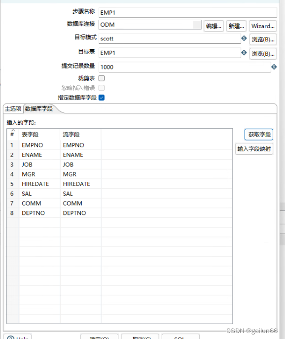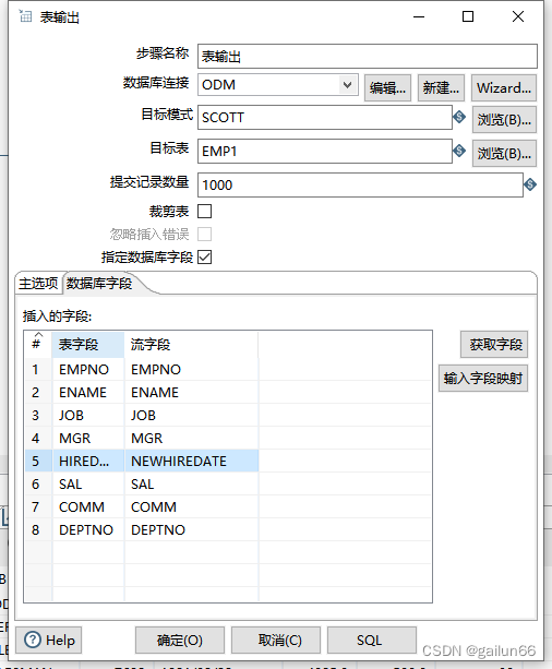 如果不添加字段选择,源数据库的HIREDATE为DATE形式,输出表的HIREDATE为VARCHAR2形式,也可以正常输出,但不是我们想要的结果,所以要添加字段选择