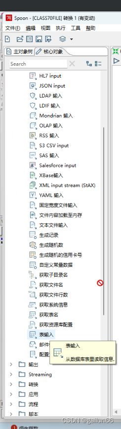 - “核心对象”区域--“输入”中,拖入“表输入”