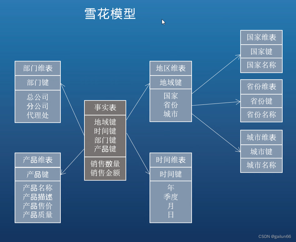 雪花型架构更加贴近OLTP系统的结构,比较符合业务逻辑,层次比较清晰。