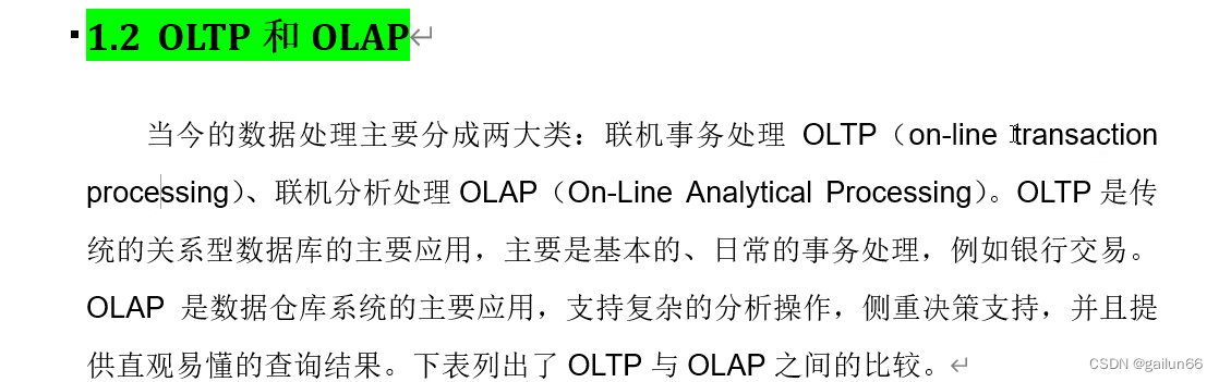 OLTP:OLTP为联机事务处理的缩写,OLAP是联机分析处理的缩写。前者是以数据库为基础的,面对的是操作人员和低层管理人员,对基本数据进行查询和增、删、改等处理。