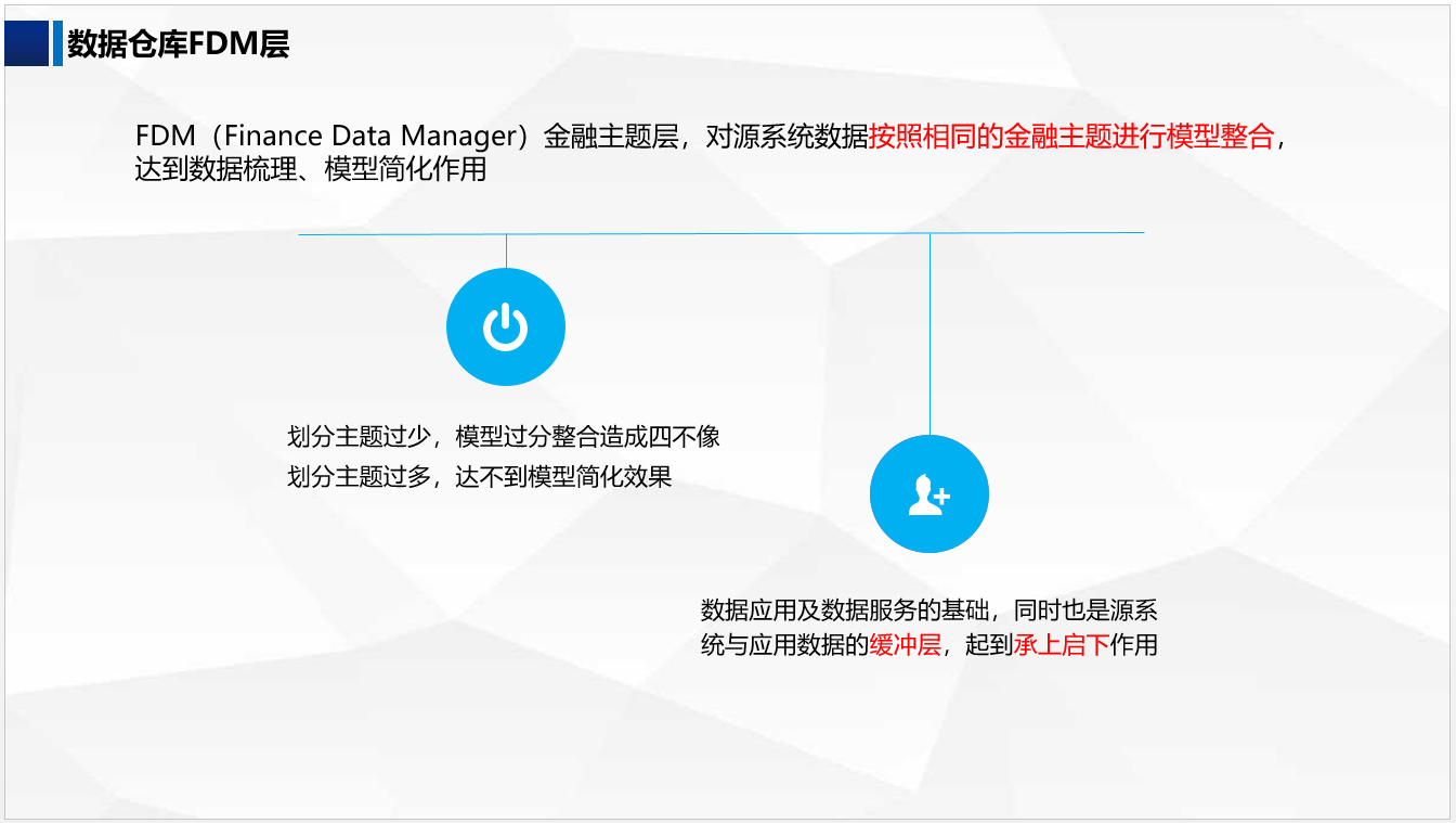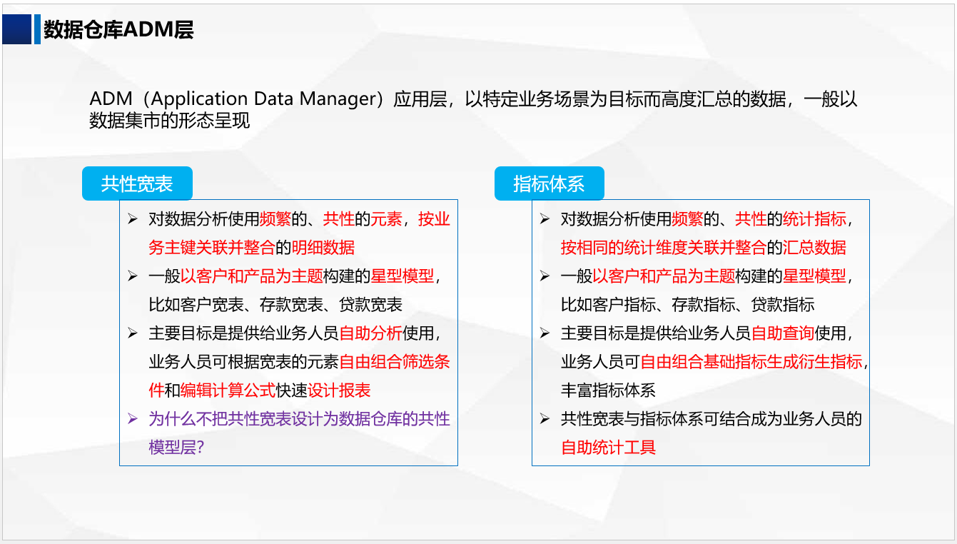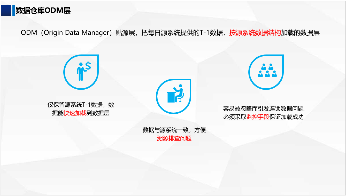 - 虽然ODM层只是加载源系统的每日增量数据,且数据结构与源系统一致,无任何复杂加工,但很多开发团队会因不重视导致底层数据加载出错,引发连锁的数据问题。解决方案可参考数据总线,关键是做好监控保证数据加载的准确性与稳定性。