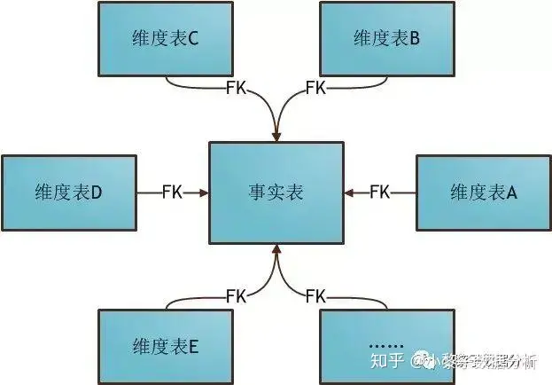 星型模型:是一种多维的数据关系,它由一个事实表(Fact Table)和一组维表(Dimension Table)组成。每个维表都有一个维作为主键,所有这些维的主键组合成事实表的主键。事实表的非主键属性称为事实(Fact),它们一般都是数值或其他可以进行计算的数据;如下图: