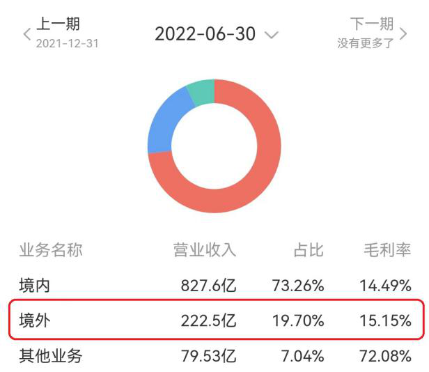 从其财报中也可见一斑:2019年末,境外营收占总营收的比重为4.37%;到了2022年6月末,比重提升为19.70%。
