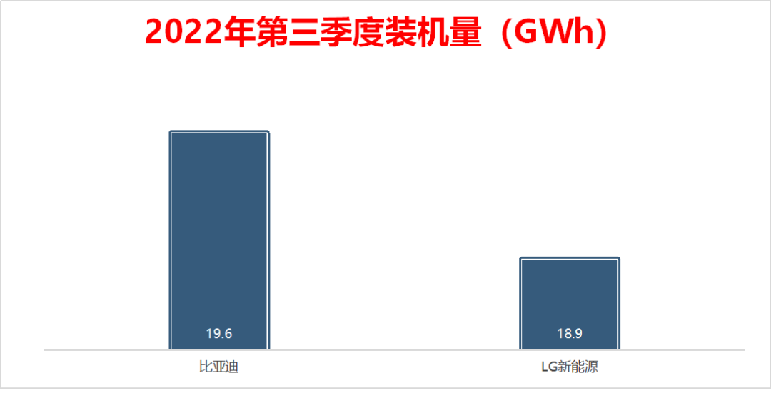2022年前三季度,比亚迪的装机量为43.6GWh,同比增长177%,市场占有率为12.8%;LG新能源的装机量为48.1%,同比增长14.1%,市场占有率为14.1%;而2021年同期,比亚迪的市场占有率为8.1%,LG新能源的市场占有率为21.6%。
