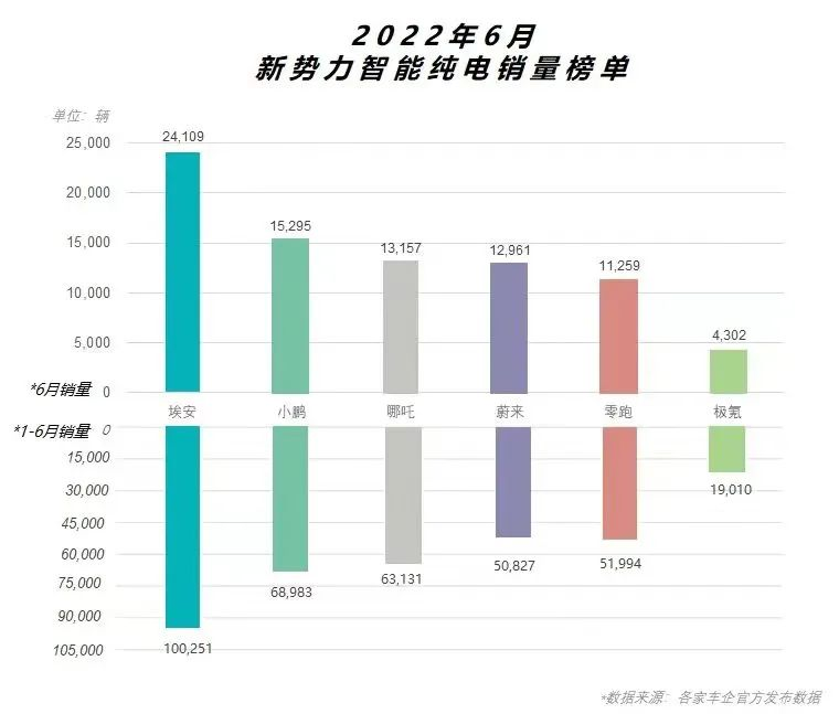 据广汽埃安官方发布的数据,6月份埃安累计销量24109台,同比增长182%;1-6月份累计销量达到100251台,突破10万辆大关。这份成绩单在一众新势力品牌中无疑是相当亮眼的仔。