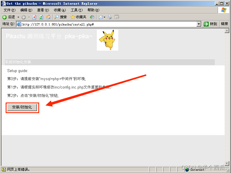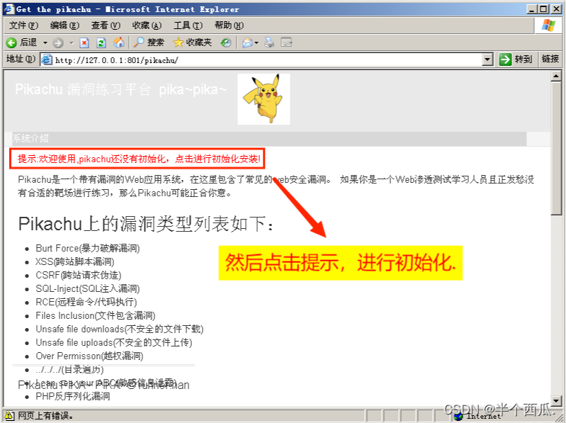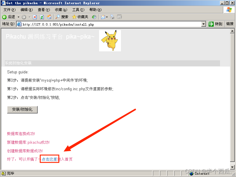 第五步:(1)打开浏览器输入 http://127.0.0.1:801/pikachu(127.0.0.1是本地的IP地址,801是端口,pikachu是目录),然后点击提示,进行初始化.