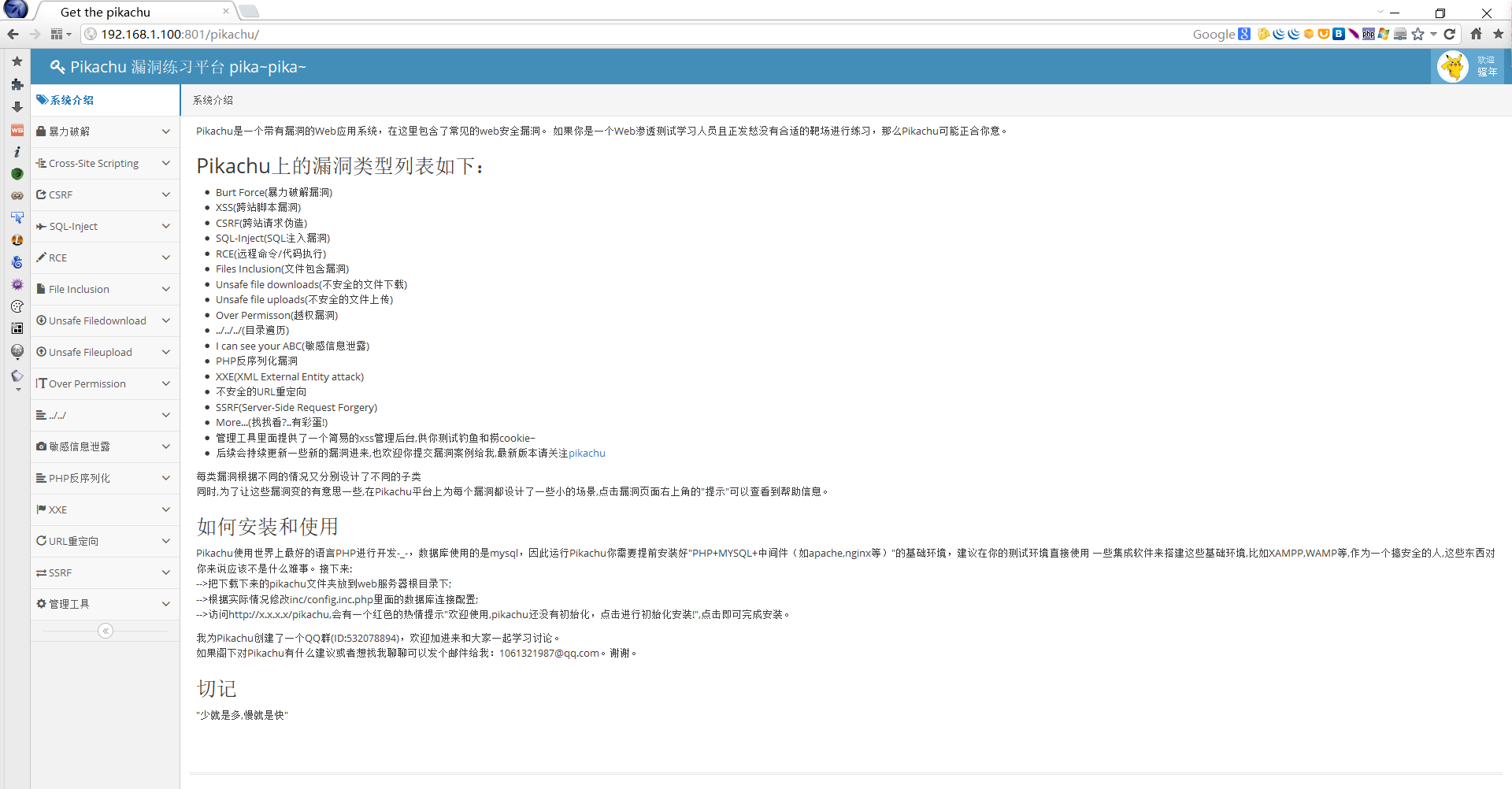 Pikachu(皮卡丘)是一个自带Web漏洞的应用系统,在这里包含了常见的web安全漏洞。如果你是一个想学习Web渗透测试人员,并且没有找到合适靶场,则可以使用这个Pikachu(皮卡丘)进行练习。(靶场包含:(1)暴力破解,(2)XSS,(3)CSRF,(4)SQL注入,(5)RCE,(6)文件包含,(7)不安全的文件下载,(8)不安全的文件上传,(9)越权,(10)目录遍历,(11)敏感信息泄露,(12)PHP反序列化,(13)XXE ,(14)URL重定向,15.SSRF)