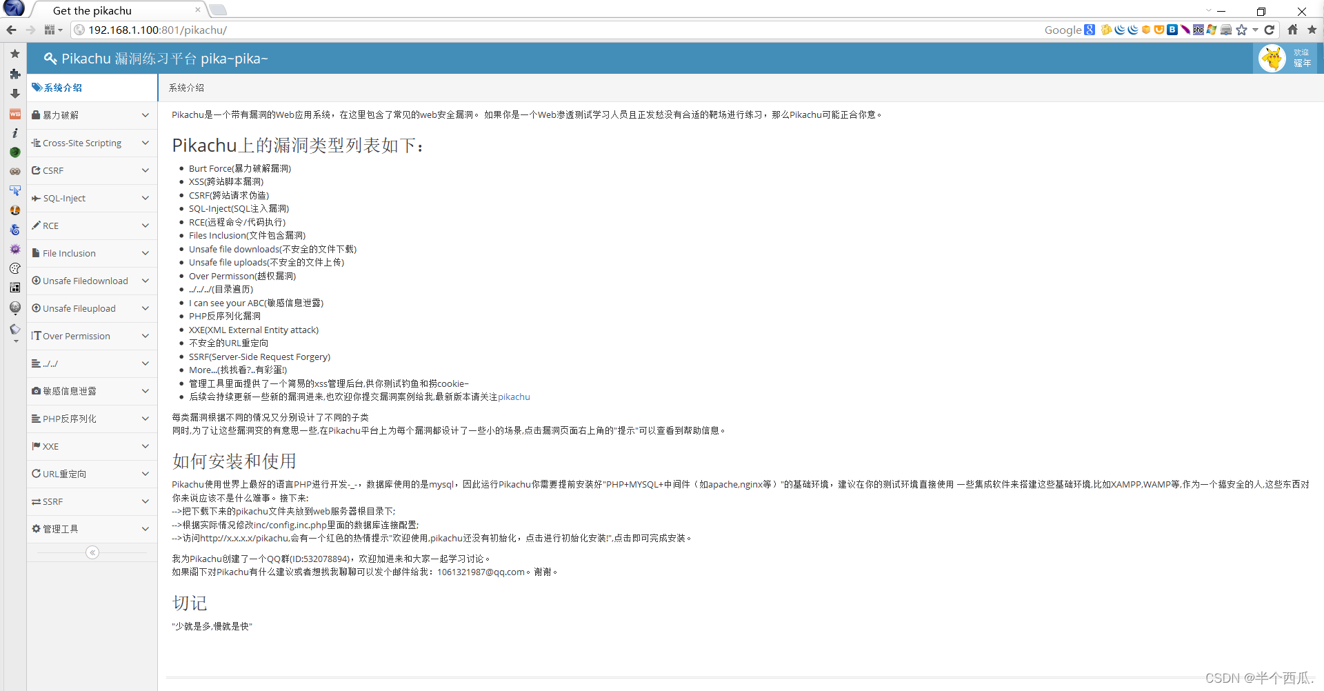 Pikachu(皮卡丘)靶场 链接:https://pan.baidu.com/s/1BwcMAVBCcLLXOmX7mIYemA