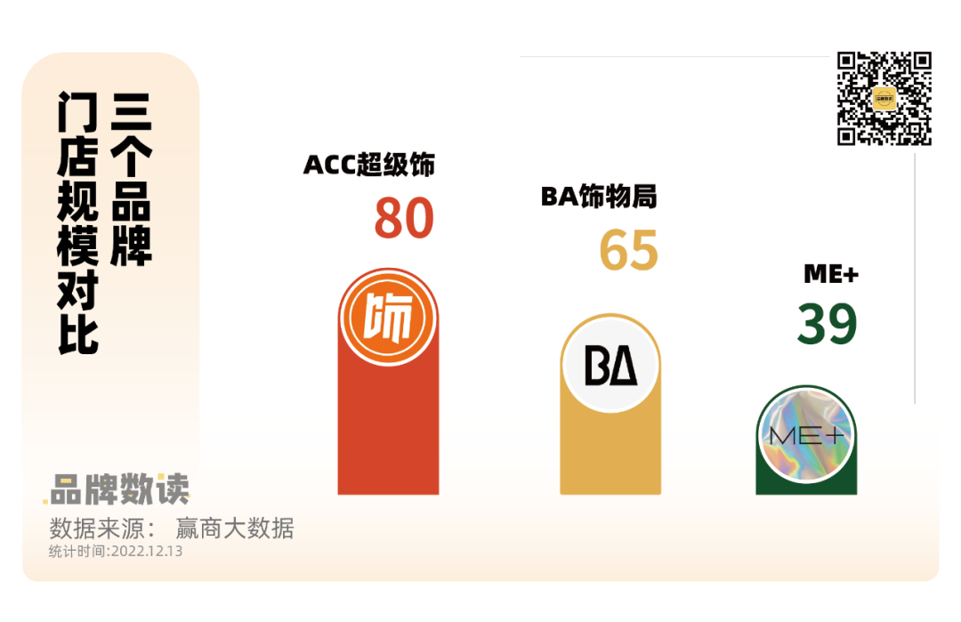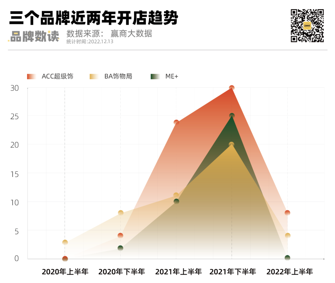 如今低调关店,不仅是单个品牌的撤退,而是一场集体撤退。从节点上看,这一赛道的代表品牌ACC超级饰、BA饰物局、ME+饰品上一次大规模开店均是在2021年第四季度,且官宣门店数都是一批,而最新的门店都是在今年6月,官宣的门店只有个位数。