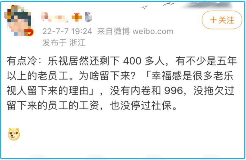 一名大V在其微博上发文称,乐视还剩400多人,有不少是五年以上的老员工。并感叹这是一家幸福感很强的公司。