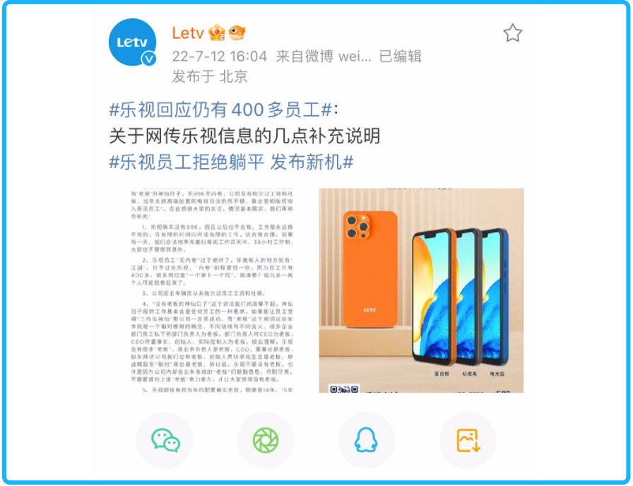 7月11日,Letv官方微博账号@了发布这则“冷知识”的微博,并回复称:“对,我们还有400人,期待新朋友的加入”,同时,还配上了“乐视员工拒绝躺平 发布新机”的话题为新发布的手机做宣传。