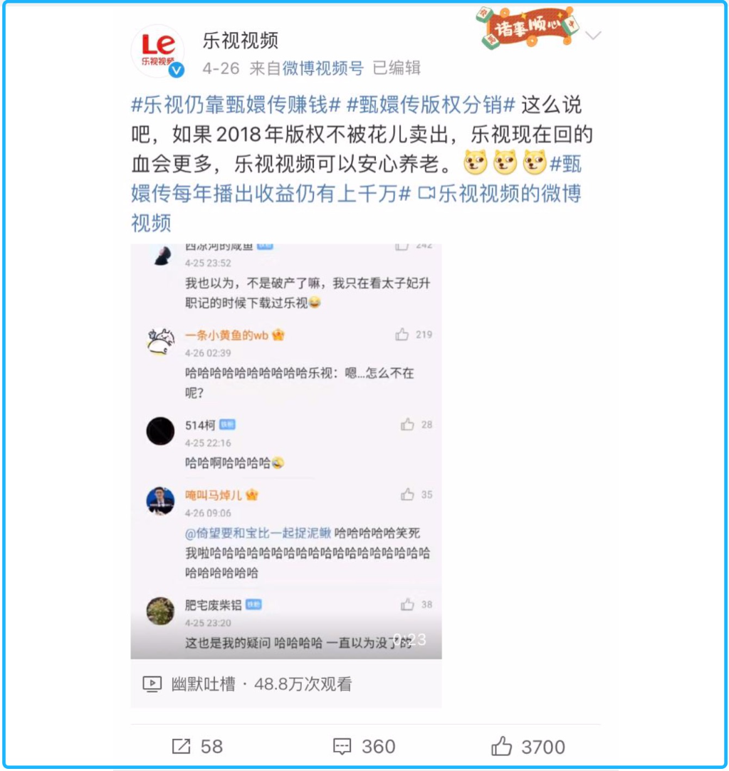 “乐视生存靠《甄嬛传》”这一话题的话题仍在微博发酵。