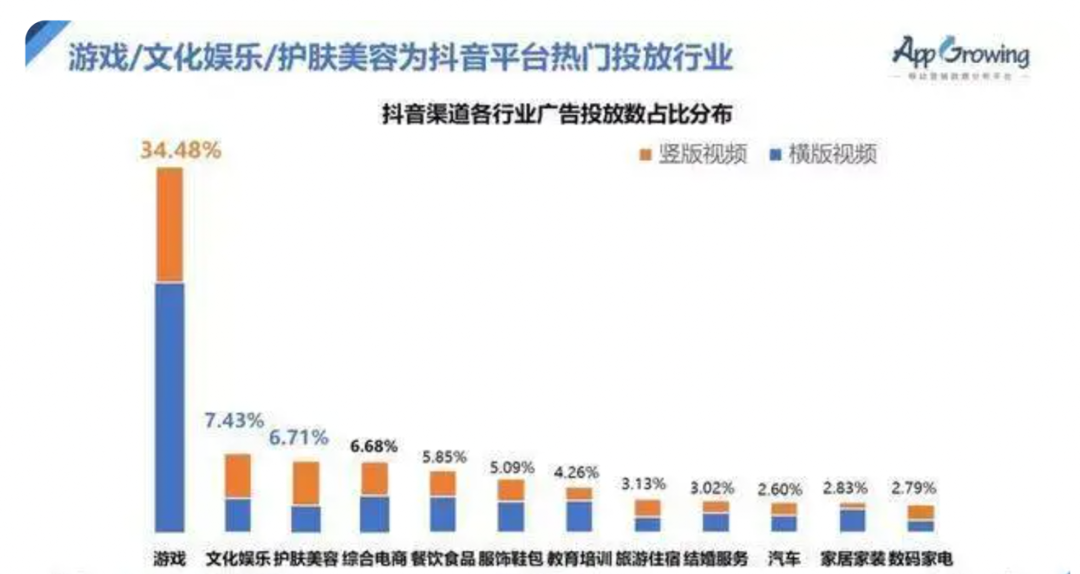 以数据为证。据移动广告情报分析平台App Growing追踪整理,抖音渠道各行业广告投放数占比分布中,游戏排名第一,比例高达34.48%,接近美妆、电商等2—6名之和。