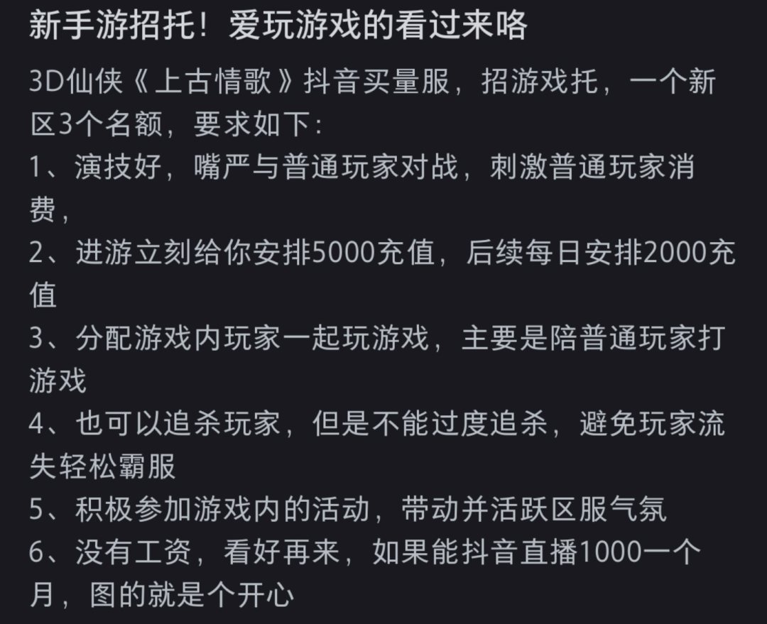 “每个游戏都有托,只是多和少、良性和恶性、明显和隐蔽的区别。”乔克解释,广义上讲,游戏主播未尝不是一种托,只不过很多大型游戏的托是让游戏在圈内有更大的曝光量,提升吸引力,行为并不恶劣。