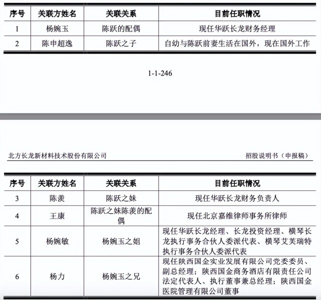 招股书称,实控人陈跃的妻姐杨婉敏在北方长龙多家关联公司担任高管,包括北京华跃长龙经理、长龙投资经理、横琴长龙执行事务合伙人委派代表、横琴艾芙瑞特执行事务合伙人委派代表。