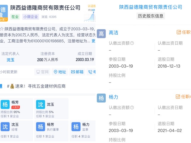 其中,西安鸿奇商贸的合伙人高洁(持股50%),早在2003年就与杨氏姐妹兄长杨力合开一企业:陕西益德隆商贸有限责任公司。