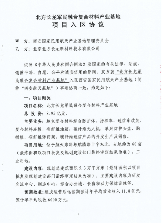 2019年5月,北方长龙与西安国家民用航天产业基地管委会签订项目入区协议。此时,其营收刚刚突破6千万,但这并不妨碍协议中“大胆预测”道:“北方长龙军民融合复合材料产业基地”占地60亩,规划总建面5.3万平米,总投资8.95亿元,预计建成后“年平均营收11.8亿元,平均税收每年6千万。”