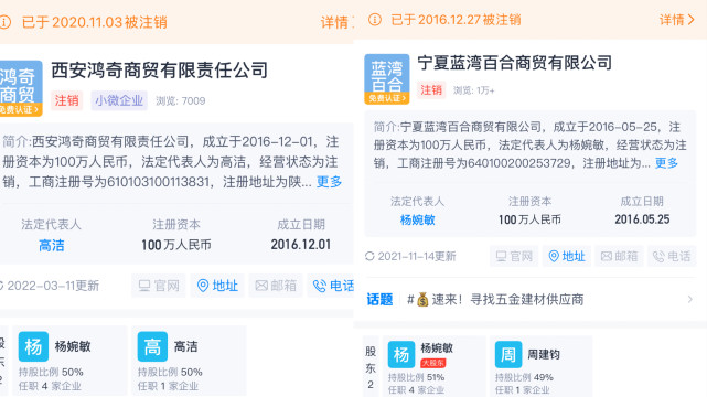 2016年年中和年尾,杨婉敏与人合股开设两家企业:西安鸿奇商贸有限责任公司、宁夏蓝湾百合商贸有限公司。