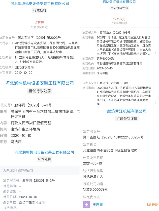 供应商中,如河北润坤机电、廊坊秀江机械等,还多次因违反环保规定受到行政处罚。
