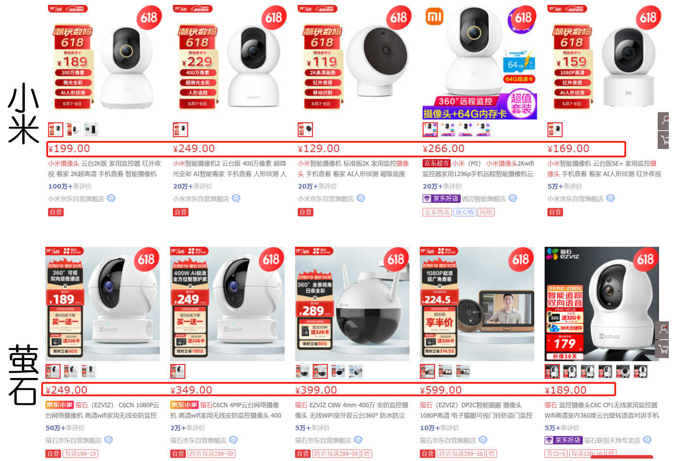 对比之下,萤石热销的C6CN 云台网络摄像机标配版起售价就要249元,4MP云台网络版单价在350元左右,针对安防应用场景的DP2C智能猫眼摄像机售价更是接近600元,比小米高出一个档次。