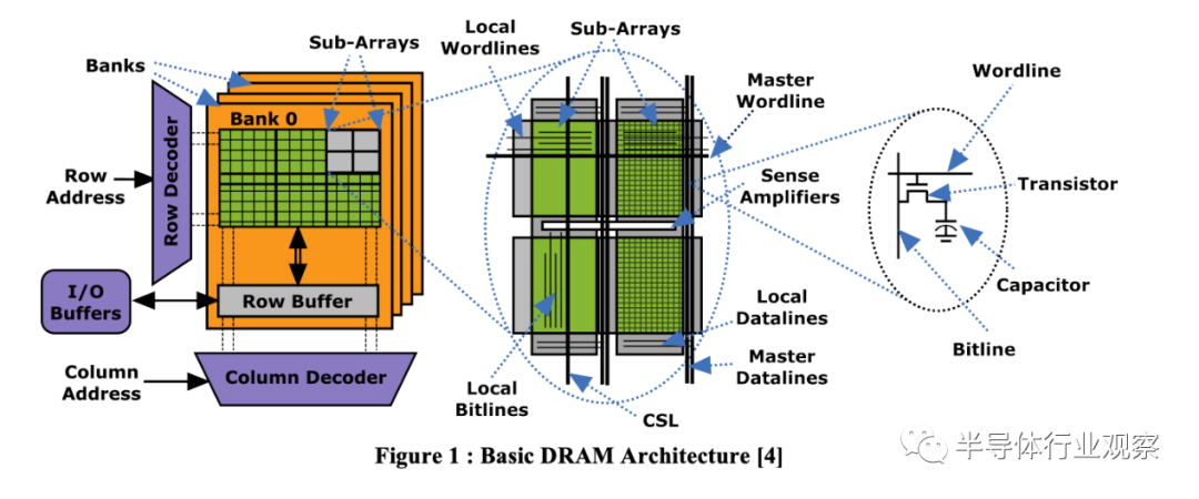 如下图所示,传统的DRAM 被组织为一组存储体,其中包括排列成行和列阵列的存储元件。存储器阵列以存储器子阵列的分层结构分组,以实现高效布线和降低功耗。每个存储单元都被建模为晶体管电容器对,数据作为电荷存储在电容器中。每个子阵列中的各个单元也被连接到本地字线和本地位线。这个微型一电容一晶体管设计使其非常适合将大量存储单元封装到小面积中以实现高密度和高存储容量。而事实上,也有数十亿个 DRAM 单元可以被压缩到一个内存芯片上。