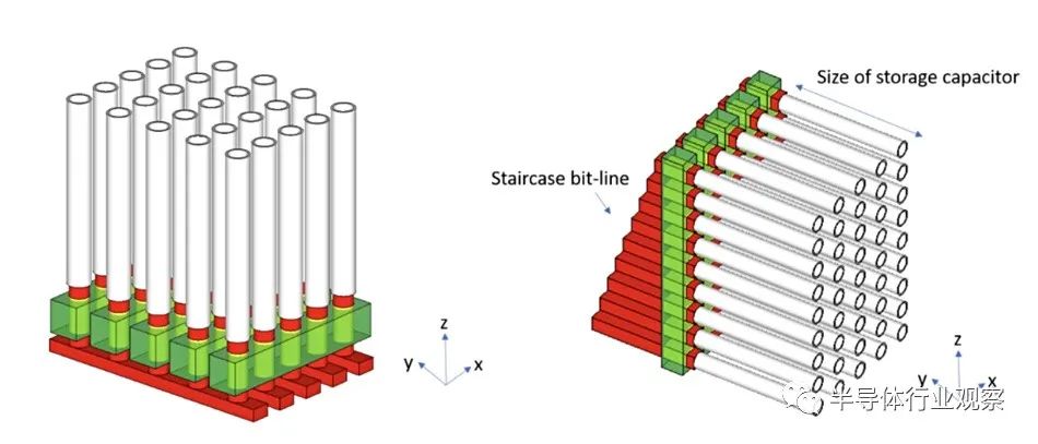 但是,如果将其翻转到一边并旋转 90 度,则可以使用每层位线的阶梯设计对单元进行分层。这样,在 DRAM 制造过程中用于制作层的光刻图案化工艺可用于所有层——所谓的共享图案化——进而简化了制造工艺。