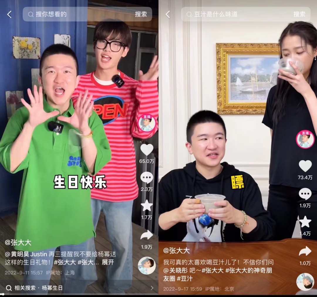 第三步,实时合作明星流量为自己造势。张大大签约无忧后,第一个视频就是和杨幂的滑雪视频,杨超越会心甘情愿地配合他拍土味视频,关晓彤、柳岩、黄明昊都是他私交甚密的圈内好友。