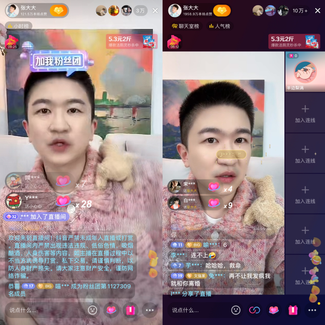 现在大多数明星都会“下凡”直播,但怕挨骂或者说错话,会在和网友互动时忽略敏感性评论或直接关闭评论功能,张大大采用多人连麦聊天的方式,直接拉满了网友对于劲爆吃瓜的预期。