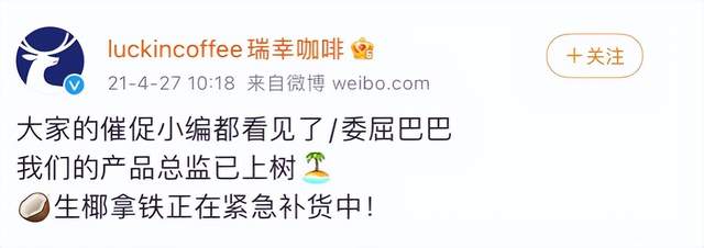 事实上,早在去年时,瑞幸就因椰子供应商短缺,导致大火的椰子拿铁在多家线下门店断货。甚至当时的瑞幸官微甚至调侃道:我们的产品总监已上树,生椰拿铁正在紧急补货中!