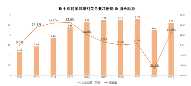 在资本的强势助推下,我国咖啡企业数量也迅速增加。据企查查数据显示,2021年我国新增咖啡相关企业2.59万家,同比增长12.5%,平均每天注册达70家。