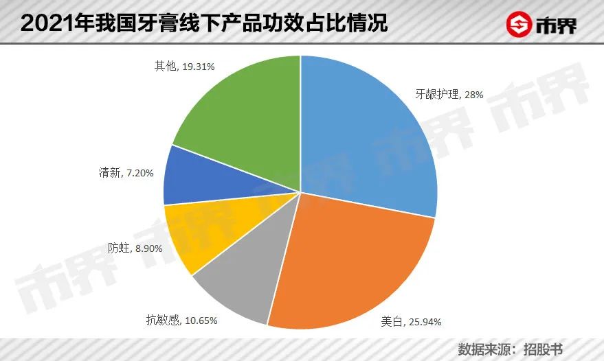 在口腔护理这块大蛋糕中,排名第一的就是牙膏市场,而牙膏市场按功效又分为美白类、牙龈护理类(中草药)、抗敏感类和其他类。其中美白类和牙龈护理类牙膏的占比超过53%,抗敏感类的市场销售占比仅有10%。