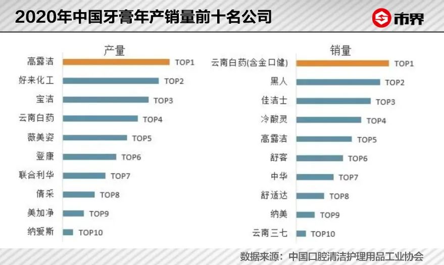 在功效之下,外资、国企和民营几大牙膏品牌轮流“坐庄”,反复上演着“三国杀”。2020年国内牙膏年销售前十名的品牌依次为云南白药(含金口健)、黑人、佳洁士、冷酸灵、高露洁等。