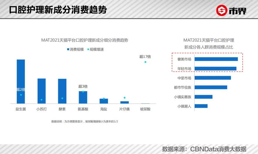根据2021天猫口腔护理消费趋势洞察白皮书,成分创新是口腔护理市场主要趋势之一,越来越多成熟的化妆品、食品成分,如益生菌、小苏打、酵素、氨基酸等。