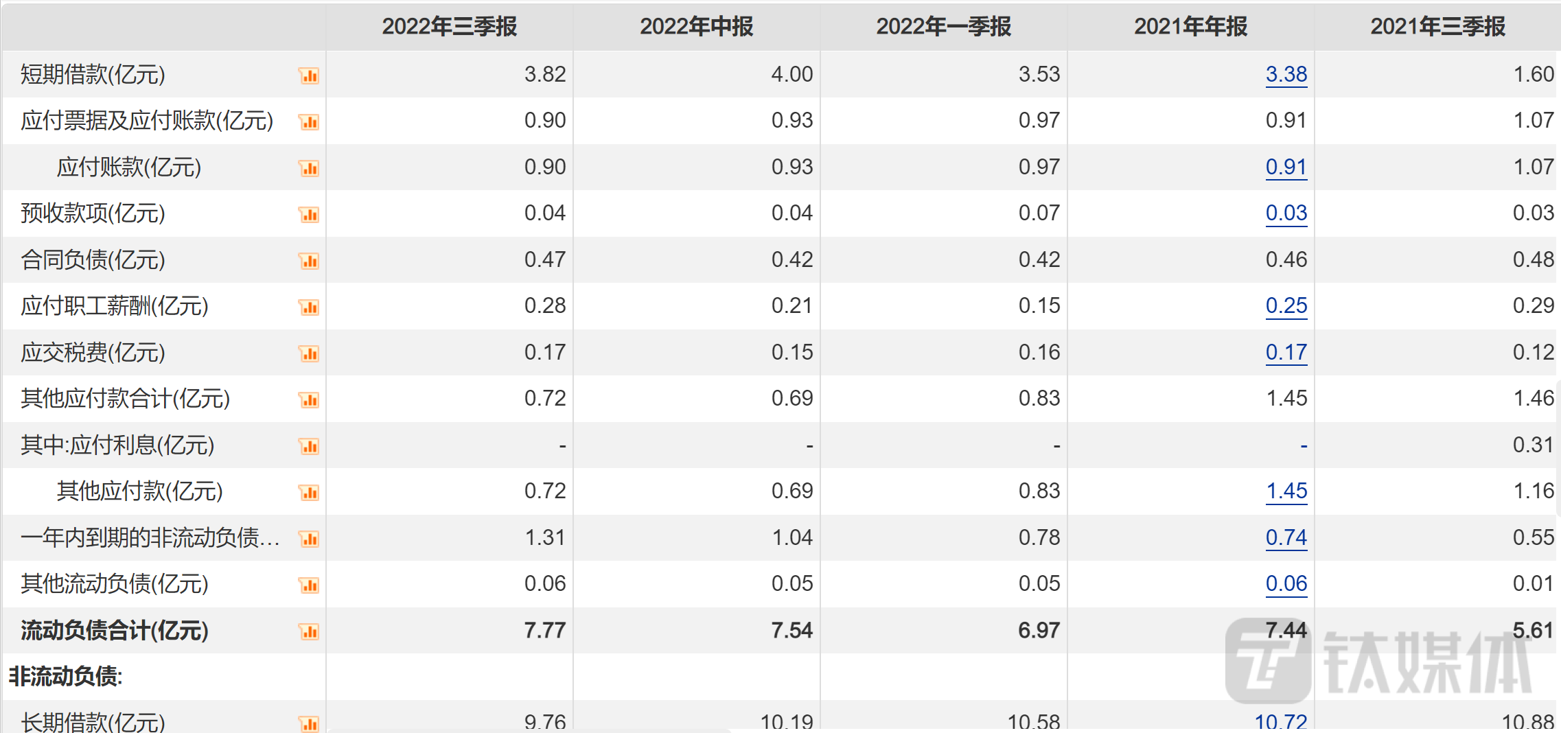 2022年三季度业绩公告显示,翰宇药业的短期借款有3.823亿元,一年内到期的非流动负债1.305亿元,合计超过5亿元,长期借款就更多了,达到9.759亿元。不管短期还是长期借款迟早都会到期,再加上其自身主营业务处于严重亏损的境地,资金链可谓是捉襟见肘。