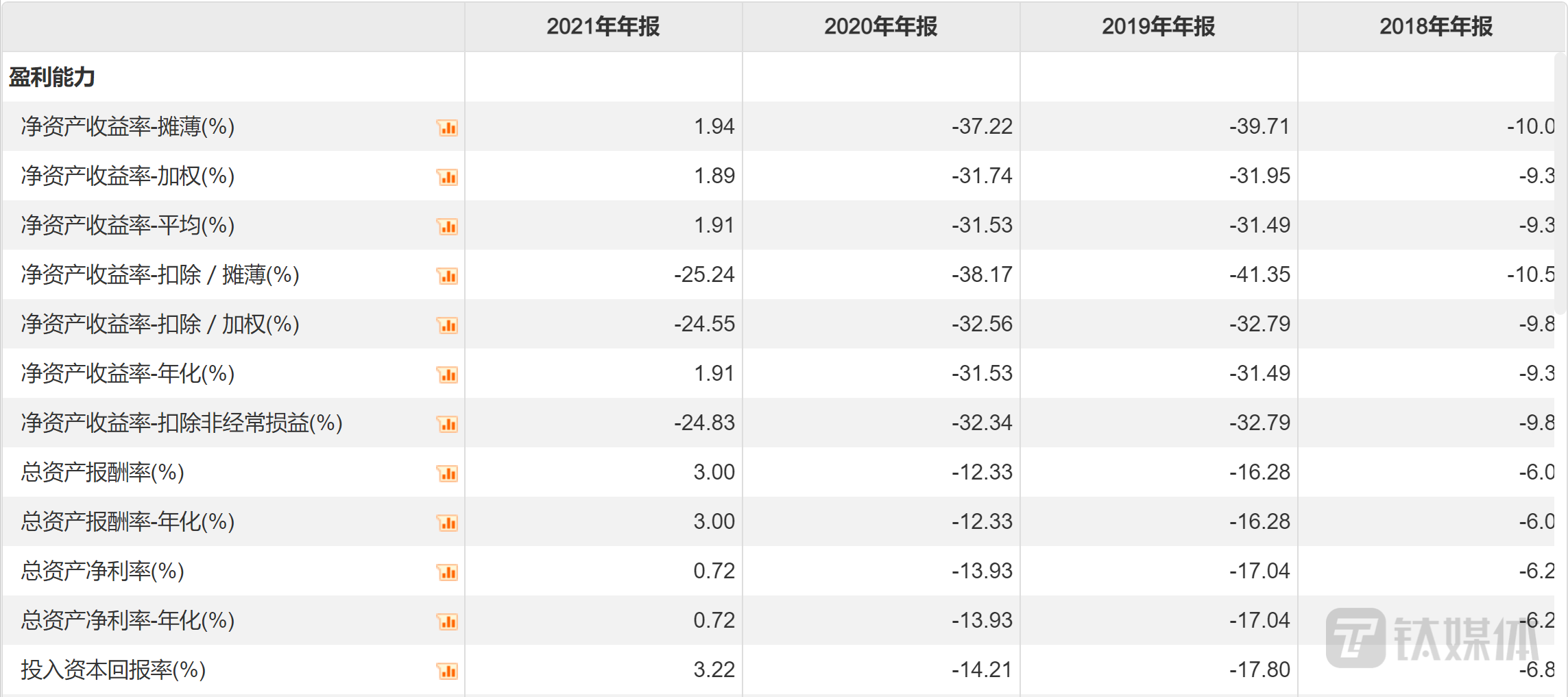 而且从整体上看,翰宇药业的盈利能力较差。根据Chioce数据,2018-2021年,公司加权ROE分为为-9.39%、-31.95%、-31.74%、1.89%。