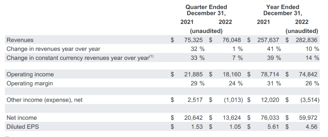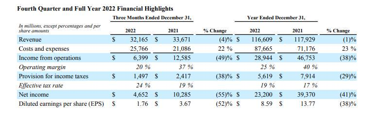 同时,该公司还披露了2022年度业绩,期内实现营收2828.36亿美元,同比增长10%;实现净利润599.72亿美元,同比下降21%;实现每股摊薄收益4.56亿美元,低于去年同期的5.61亿美元。