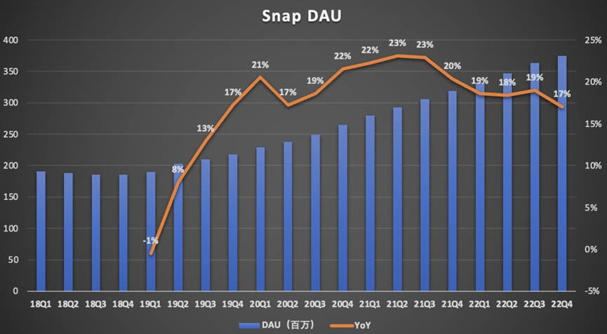 于是作为社交平台的重要衡量指标,Snapchat每日活跃用户同比增速也在放缓。财报显示,Snapchat第四季度日活用户 (DAU) 为3.75亿,同比增长17%,低于上一季度19%的同比增速,以及上年同期20%的同比增速。