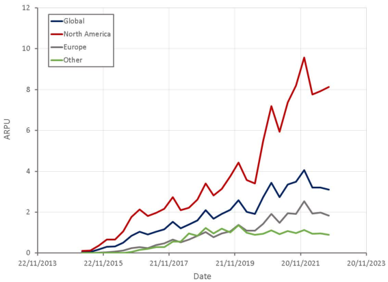 最终的结果也能极为直观的看到:Snapchat的ARPU值已经连续三季度同比下滑,数据显示,2022年第四季度,Snap的ARPU值为3.47美元,相比上年同期的4.06美元,下滑15%。