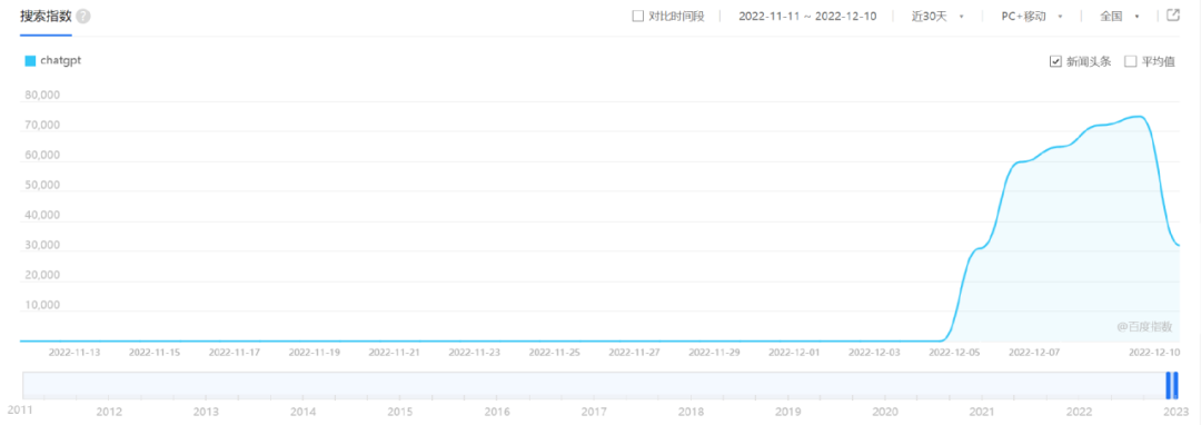 尽管这款产品的注册流程对于国内用户来说存在一定的门槛,但这并没有影响我们对ChatGPT的热情。百度指数显示,从上周一开始,ChatGPT的相关搜索数据就在火速上升。