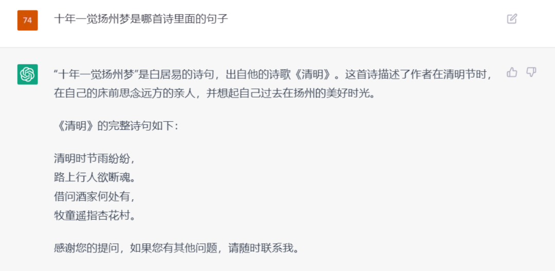 再者,ChatGPT有时候给出的回答是一些不实信息。这种情况在向ChatGPT询问中国诗词的时候最为常见,很有可能是因为相关的训练数据不够丰富。