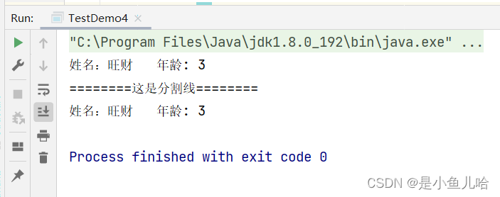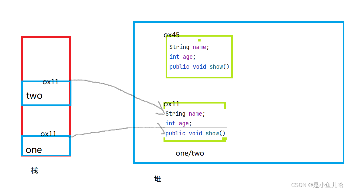 class Dog { String name; int age; public void show() { System.out.println("姓名:" + name + " 年龄: " + age); } } public class TestDemo4 { public static void main(String[] args) { Dog one = new Dog(); Dog two = one; } }