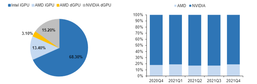 聊到GPU,很多人包括我在内第一时间想到的都是英伟达、AMD,作为全球GPU市场的领军企业占据了绝大部分的独立显卡市场份额,而集成显卡的市场份额则是由AMD与英特尔瓜分。
