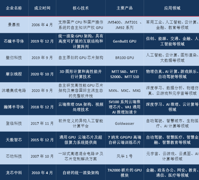 在景嘉微之外,国内的主要GPU企业还有芯瞳半导体、壁仞科技、摩尔线程、沐曦集成电路、瀚博半导体、登临科技、天数智芯、芯动科技、龙芯中科等多家企业,面向的领域基本涵盖了目前GPU应用的主要市场,如人工智能、AI计算、自动驾驶、深度学习等。