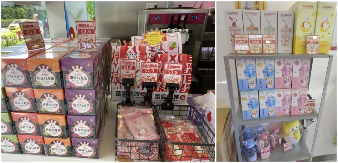 在门店里,消费者还可以买到各种高颜值雪王周边,比如说搅拌杯、圣代杯和柠檬杯,还有雪王钥匙扣和玩偶,以及各种口味的花果茶。