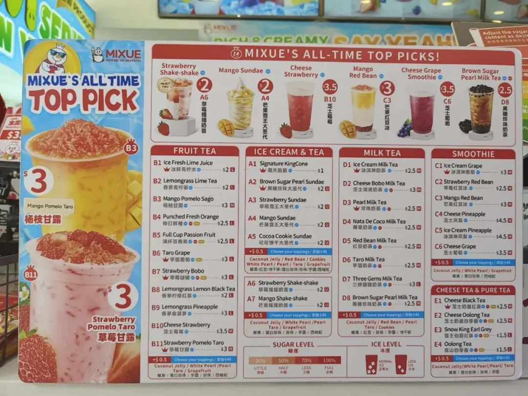 (图:蜜雪冰城金文泰门店的菜单,价格在1—4.5新币之间)